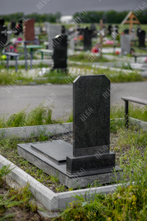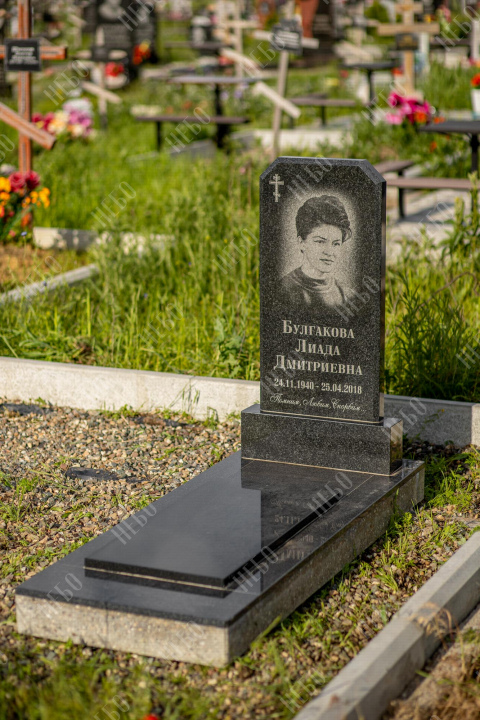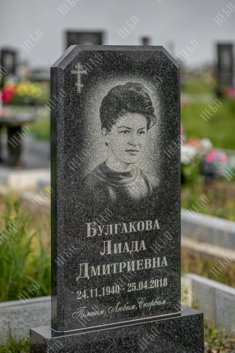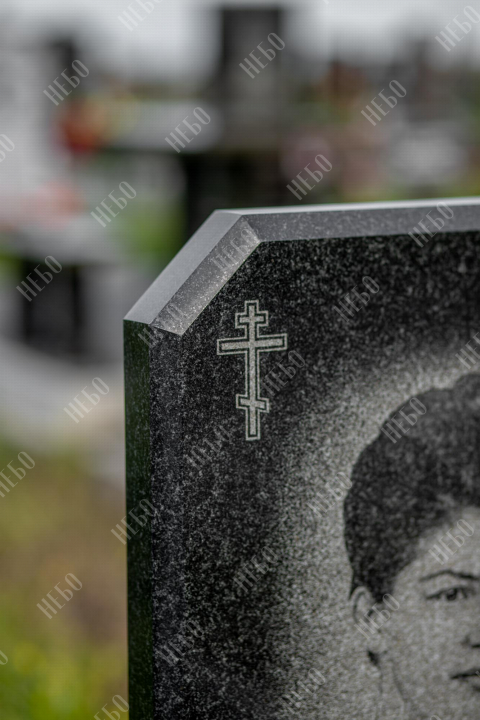 Христианский памятник с вертикальной стелой и закрытым надгробием выполнен в классическом черном цвете. Гранитная стела ритуального изделия имеет скошенные углы и дополнительно фигурно обработанные края по контуру. Такое исполнение придает внешнему виду памятника сдержанный, но в то же время оригинальный вид. Размер и форма памятника проработаны экспертами с учетом нагрузки и эстетического восприятия ритуального изделия. Закрытое  надгробие практично в уходе и при желании позволяет расположить на нем эпитафию.