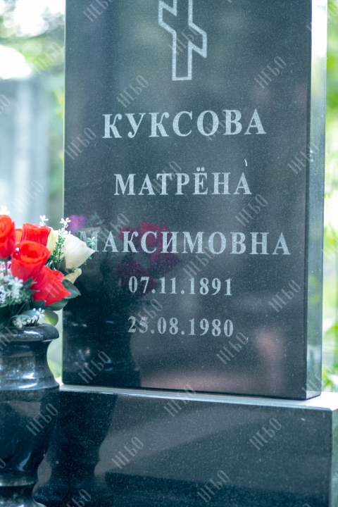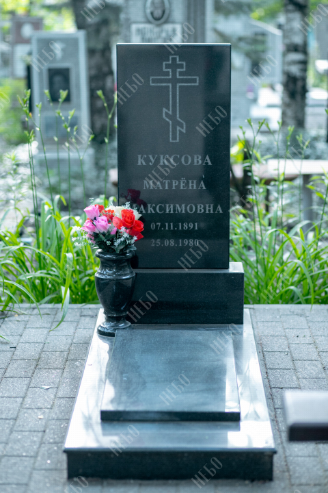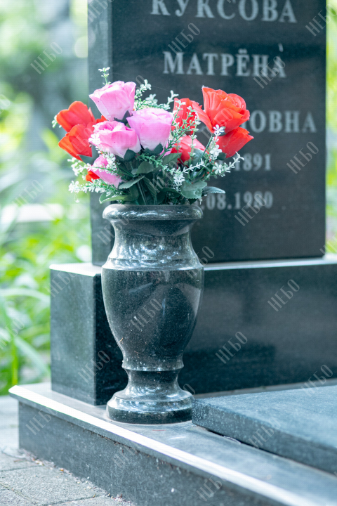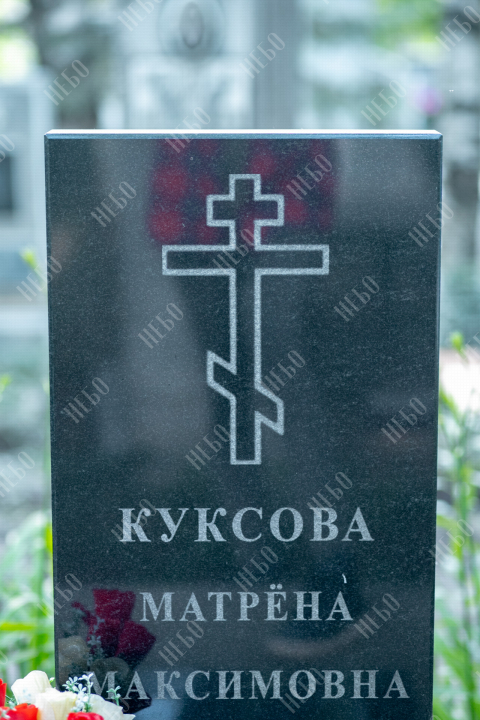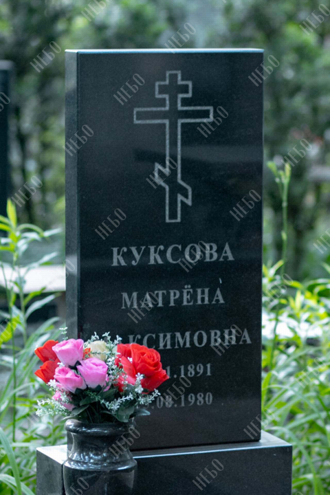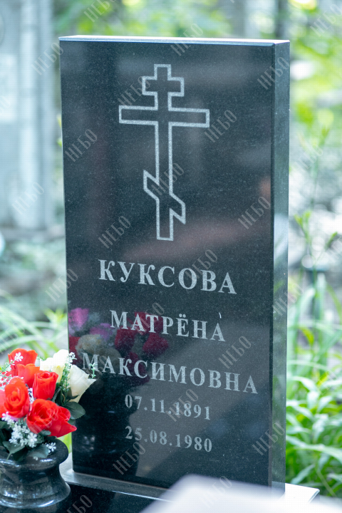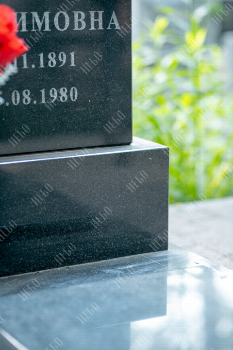 Данное ритуальное изделие изготовлено без изображения фотографии усопшего. Стелла памятника содержит изображение ангела и информацию о покойном, нанесение которой выполнено алмазными иглами на современном оборудовании. Использование технологии такой гравировки исключает любые деформации текста, он не подвержен стираемости и виден в любую погоду. Данный памятник служит отличным примером тому, что и без нанесения фотографии ритуальное изделие может выглядеть достойно и презентабельно, соответствуя всем религиозным канонам.