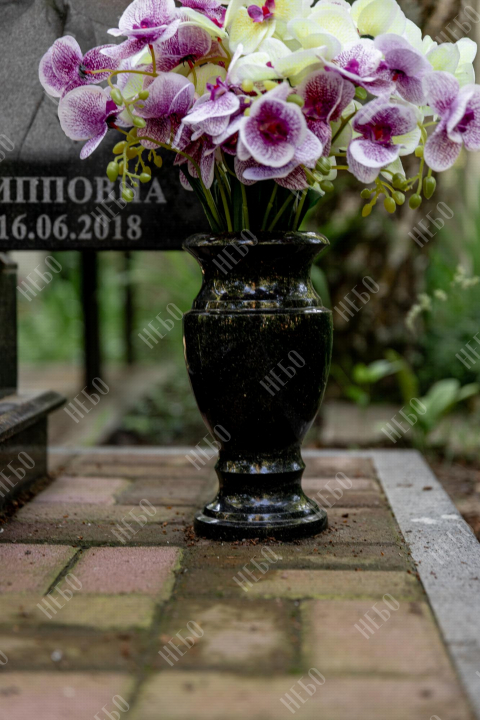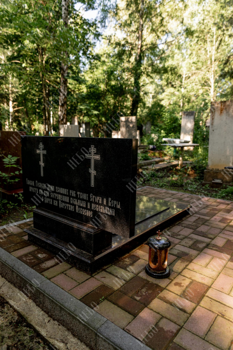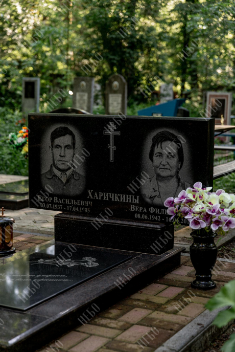 Горизонтальный семейный памятник с вазой , лампадой и закрытым надгробием. Невысокая надгробная стела прямоугольной формы содержит фото, информацию об усопших и изображение креста. Она отлично сочетается с закрытым гранитным надгробием. Такое решение является практичным и значительно упрощает уход за ритуальным изделием. Размеры памятника тщательно проработаны специалистами, что гарантирует конструкции долговечность и надежность.